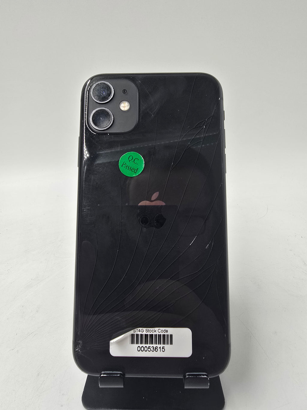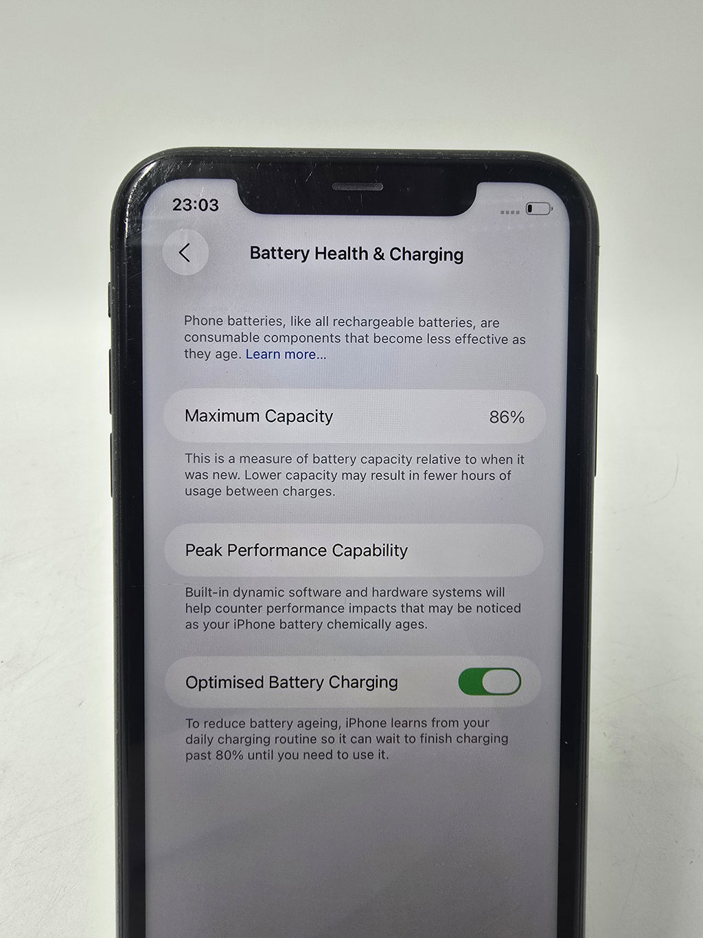 Cleaned, Tested & Working. Cracked Back Glass. Scratches on Screen. 86% Max Battery Health. Scuffs on Rim Housing.
